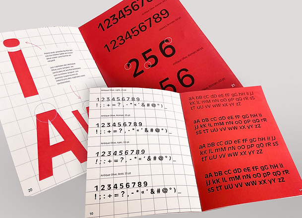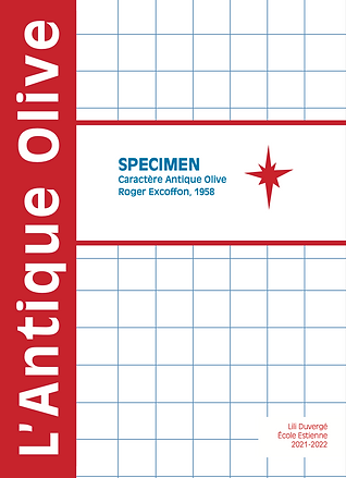 Création d’un spécimen pour le caractère « Antique Olive ». Recherches approfondies sur son contexte de création, son créateur et ses ambitions. L’Antique Olive ayant pour caractéristiques majeures d’être fonctionnelle, universelle et lisible, volonté de créer un objet qui évoque un manuel scolaire. Les pages quadrillées sont le fil conducteur du spécimen et rappellent les cahiers d’écriture qu’ont les enfants.