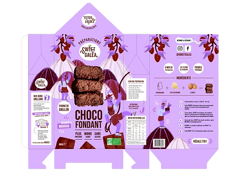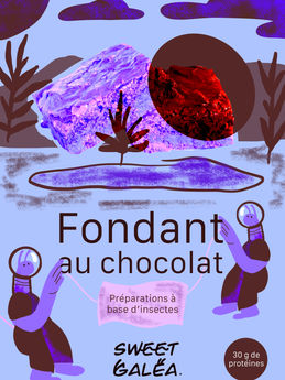 Projet de diplôme. Création du packaging des deux premières recettes de la marque fictive Sweet Galéa (préparations gâteaux à base de farine d’insecte pour une cible de jeunes adultes 20-25 ans) : le « Choco Fondant » et le « Carrot Cake ». Élaboration du rédactionnel, de la mise en page et des illustrations. Une fois le packaging créé, impression et montage des maquettes et réalisation de clichés de mise en situation du produit. Utilisation marketing de mes illustrations.